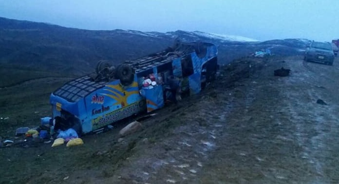 La Paz, 6 de diciembre (Urgentebo) .- Cinco personas muertas y 18 heridos son el saldo de un vuelvo de campana de un omnibus que ocurrió en el tramo Escoma Wilacala, la medianoche de este martes. El vehiculo forma parte de la flota Altiplano se dirigía desde el municipio de Apolo hasta la ciudad de La Paz.