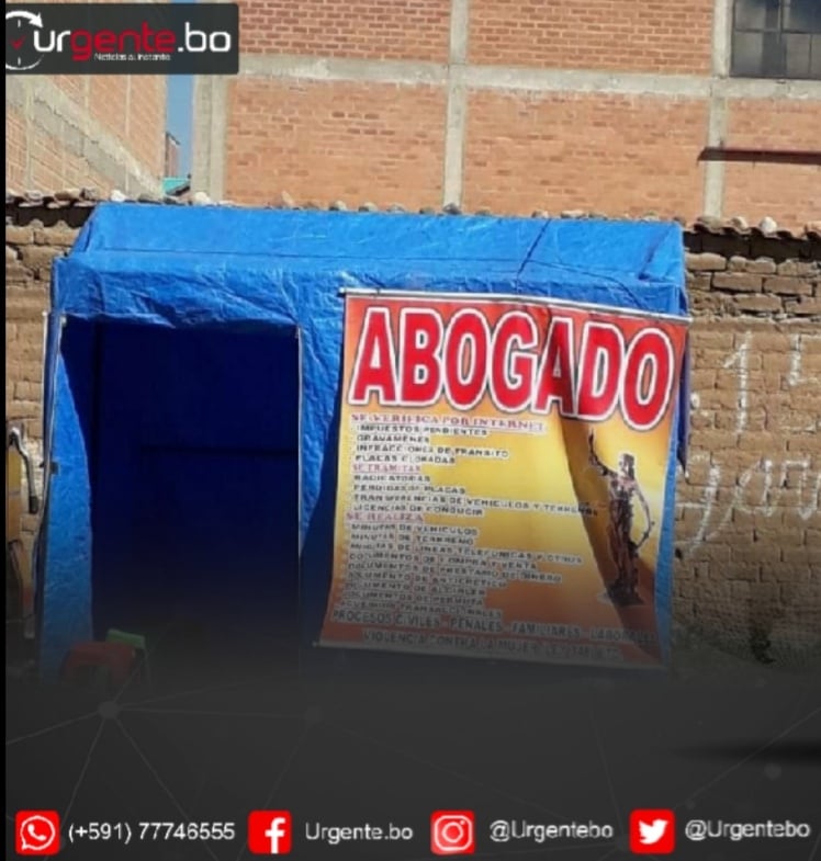 30 de junio (Urgente.bo).- Un abogado tomó la decisión de colocar una carpa para ofrecer sus servicios a la ciudadanía. Según la imagen que circula en las redes sociales estaría ubicado en la ciudad de El Alto.