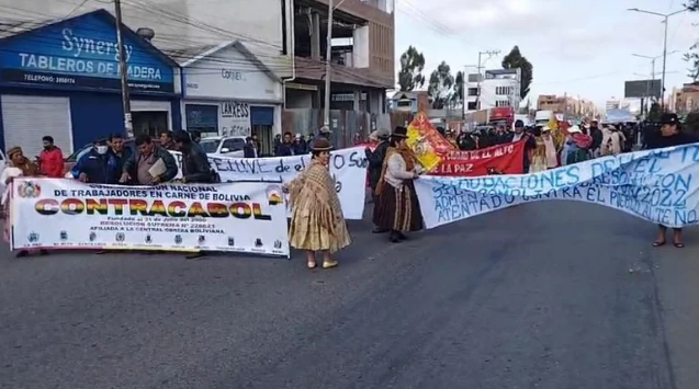 18 de enero (Urgente.bo).-El sector de afiliados a a la Confederación Nacional de Trabajadores en Carne de Bolivia (Contracabol) se movilizaron en El Alto en rechazo de lo que denominaron un "impuestazo", por la actualización de la tasa de aranceles. Ante las protestas, las autoridades decidieron hacer una pausa en la nueva medida hasta reunirse con los 14 distritos.