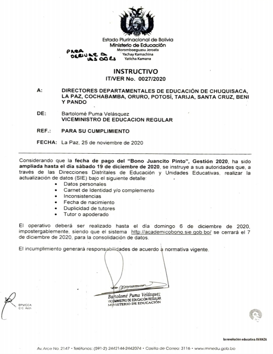 “Considerando que a la fecha de pago del Bono Juancito Pinto, gestión 2020, ha sido ampliada hasta el día sábado 19 de diciembre de 2020”, dice parte del instructivo dirigido a los directores departamentales de educación de cada departamento del país.