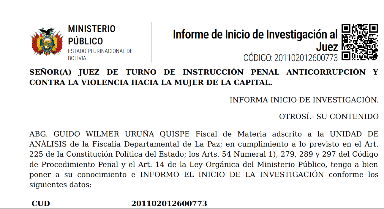 El fiscal Wilmer Uruña Quispe solicitó el inicio de la investigación del caso ante el juez de turno de instrucción en lo penal y corrupción contra Vaca Lima y Vaca Pereira por el delito de estafa previsto en el Código Penal.