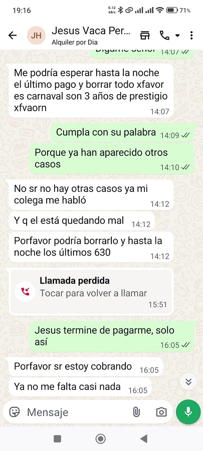 Desde la ciudad de La Paz, Carrafa hizo averiguaciones y estableció que Vaca Pereira le “puso una excusa aún más baja: que ‘habían atropellado a su hija’ para justificar el retraso. Solo después de amenazas legales constantes, mi amigo logró recuperar su dinero en dos pagos. En mi caso, el host sigue haciéndose la burla”.