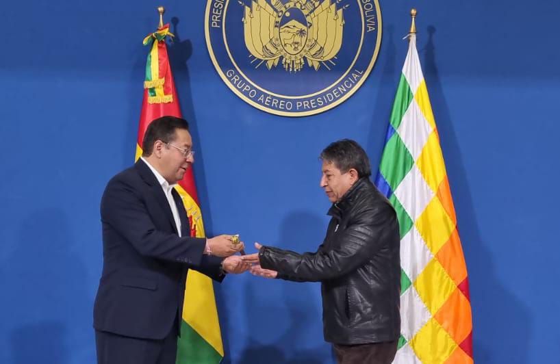 A tempranas horas de este domingo, antes de iniciar el viaje, Arce entregó al vicepresidente David Choquehuanca el Bastón de Mando presidencial.