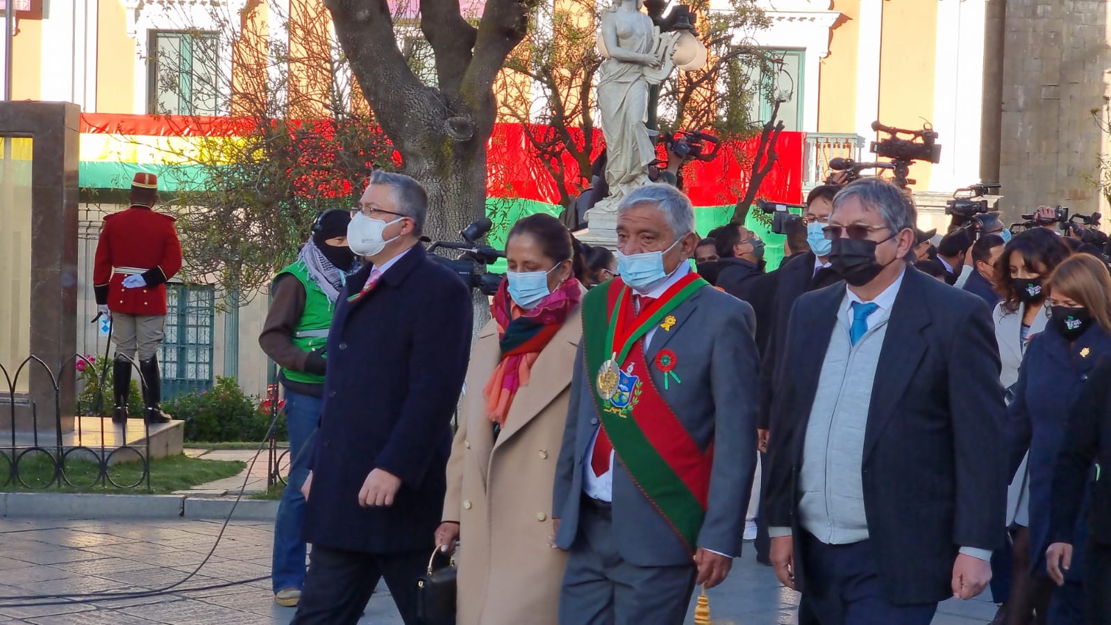 Después de la iza de la bandera, el presidente Arce encendió la Tea de la Libertad situada en una de las esquinas de la plaza, frente al Palacio de Gobierno, saludó al alcalde Arias y concluyó con la entonación del Himno a La Paz.
