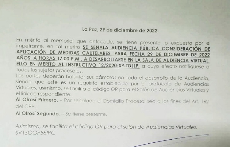 “En mérito al memorial que antecede, se tiene presente lo expuesto por el impetrante, en tal merito se señala audiencia pública consideración de aplicación de medidas cautelares para fecha 29 de diciembre de 2022, a horas 17:00 a desarrollarse en la sala de audiencia virtual ello en mérito al instructivo 12/2020-SP-TDJLP”, señala parte del documento judicial.