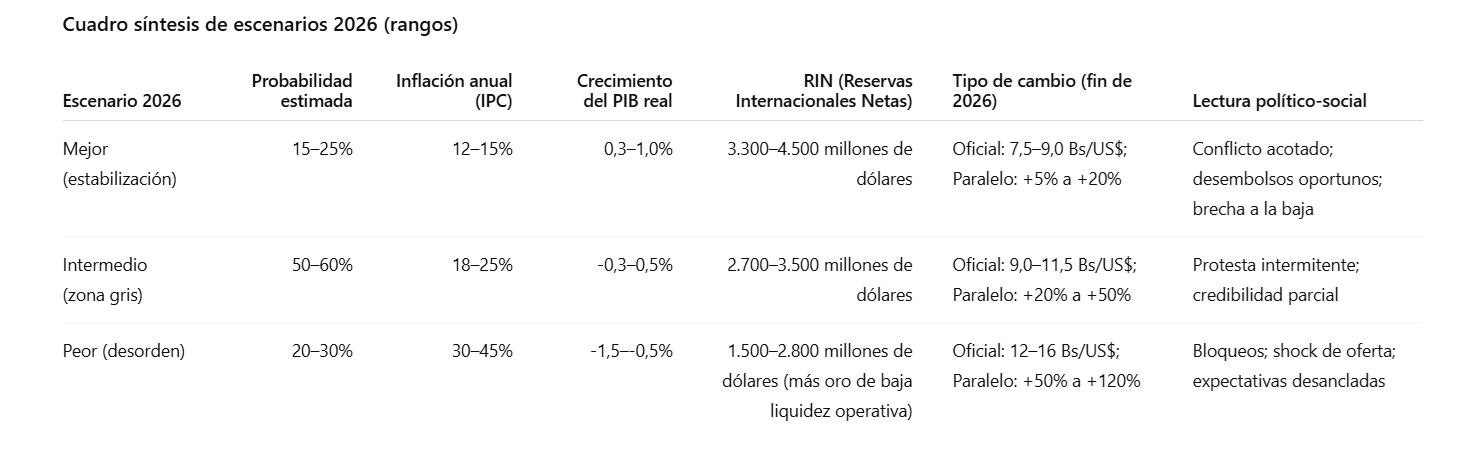 Mejor caso (15%–25% probabilidad): Financiamiento externo llega con velocidad, nuevo régimen cambiario reduce sostenidamente la brecha oficial-paralelo y conflictividad se contiene con acuerdos y alivio focalizado. Inflación desacelera a 12%–15% anual por moderación progresiva de la inercia inflacionaria y expectativas mejoradas. Crecimiento bajo pero estable con previsibilidad, inversión selectiva y reservas recomponiéndose gradualmente.