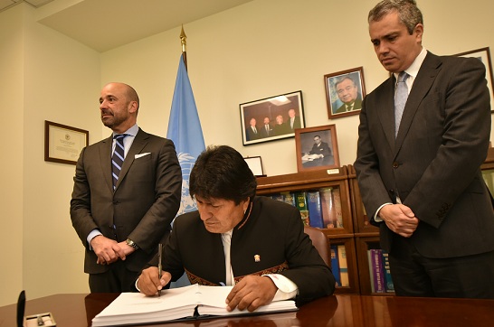 "Se ha producido una ceremonia muy importante, el presidente Evo Morales ha firmado dos, un tratado y una convención muy importante", dijo el embajador de Bolivia ante la ONU, Sacha Llorenti, en entrevista con la televisora estatal Bolivia Tv.