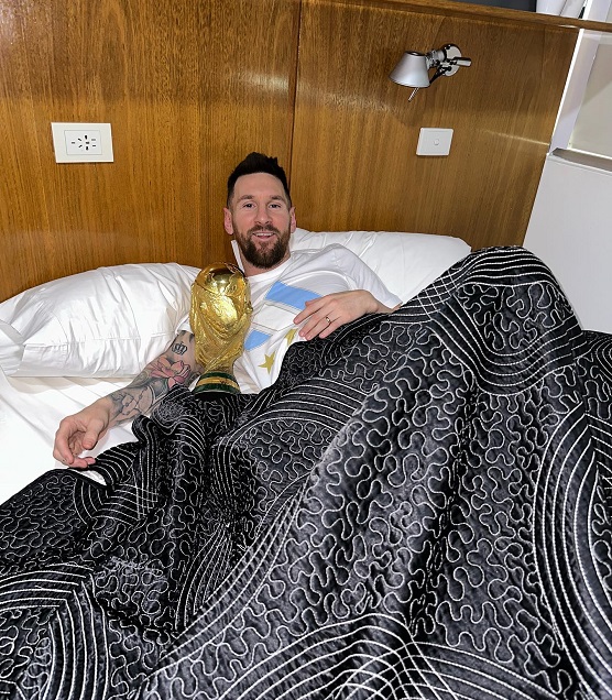 Lionel Messi, capitán y referente de la Albiceleste, fue el primero en bajar del avión junto a Lionel Scaloni. Y esta mañana irrumpió en las redes sociales con uno de los posteos más esperados, el cual enloqueció a los fanáticos. "¡Buen día!" escribió la Pulga junto a tres fotos, en la cama, junto al trofeo más preciado.