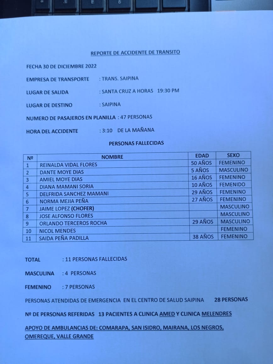 30 de diciembre (Urgente.bo).- El bus Trans Saipina se embarrancó y se reporta al menos 11 fallecidos y 23 heridos, a la altura del Mirador, municipio de Saipina, Santa Cruz,