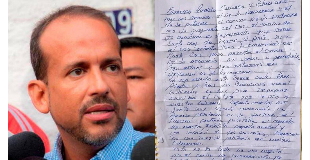 “Hoy el MAS intenta tomar la Gobernación de Santa Cruz para derrotar el camino de la democracia. No vamos a permitirlo. Aquí estamos y aquí estaremos en la defensa de la democracia. Por eso escribo esta breve carta. Para alertar a todos los bolivianos que el Gobierno de Luis Arce se propone consolidar el golpe que le dio a nuestro Gobierno Departamental de Santa Cruz”, dice parte de la misiva.