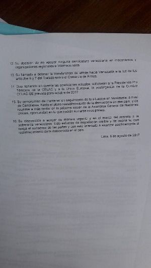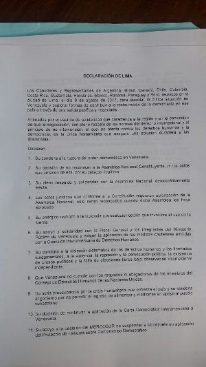 Entre los 16 puntos, los representantes de dichos gobiernos expresan “Su condena, a la ruptura del orden democrático en Venezuela, su decisión de no reconocer a la Asamblea Constituyente, ni los actos que emanen de ella, por su carácter ilegítimo. Además (dan a conocer) su seria preocupación por la crisis humanitaria que enfrenta el país y su condena al Gobierno por no emitir el ingreso de alimentos y medicinas en apoyo al pueblo venezolano”.