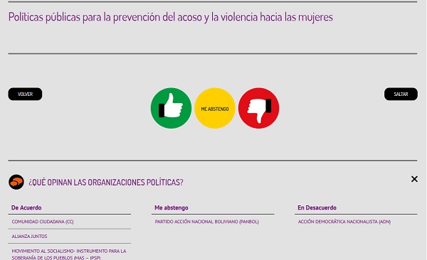 Cuatro partidos políticos (Comunidad Ciudadana, ADN, Creemos y Panbol) se abstienen en reconocer y garantizar el derecho al aborto legal. Dos (Frente para la Victoria y Creemos) están en contra de garantizar el acceso a la educación y trabajo para las personas transgénero. Un partido (ADN) está en contra de apoyar políticas públicas para la prevención del acoso y la violencia hacia las mujeres. De esto y de las posiciones que tienen las agrupaciones políticas en carrera electoral ante muchos otros temas controversiales podrás saber si entras a CANDI Dat@s (www.candidatxs.com.bo), la herramienta digital para contribuir al voto informado, desarrollada por IDEA Internacional, con el apoyo de la Embajada de la República Federal de Alemania.