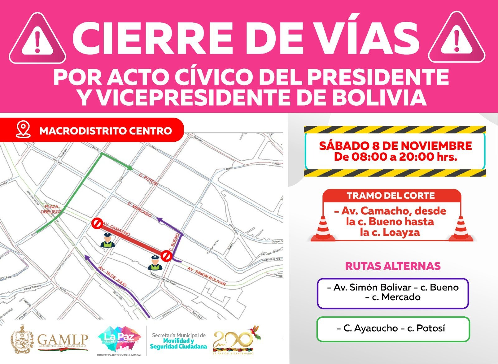 Como rutas alternas, la comuna paceña recomendó utilizar la avenida Simón Bolívar, entre las calles Bueno y Mercado, además de los tramos Ayacucho-Potosí.