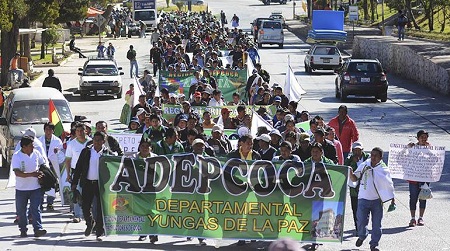 En la presente jornada, los afiliados de Adepcoca organizaron una marcha de protesta desde la zona Tejada Sorzano hasta la avenida Camacho, donde se ubican las oficinas de Desarrollo Rural y Tierras, con el fin de exigir que se aclare qué se hace con la coca que se les decomisa a los productores del norte paceño.