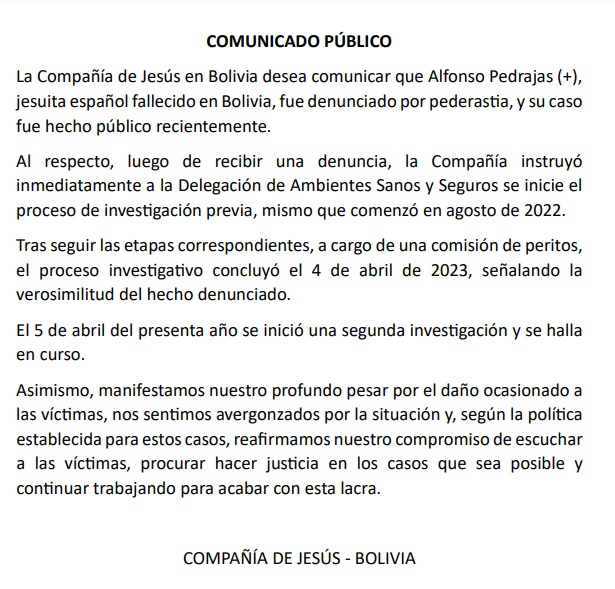 “La Compañía de Jesús en Bolivia desea comunicar que Alfonso Pedrajas (+) jesuita español fallecido en Bolivia, fue denunciado por pederastia, y su caso fue hecho público recientemente. Al respecto, luego de recibir una denuncia, la Compañía instruyó inmediatamente a la Delegación de Ambientes Sanos y Seguros se inicie el proceso de investigación previa, mismo que comenzó en agosto de 2022”, dice el comunicado publicado por ANF.