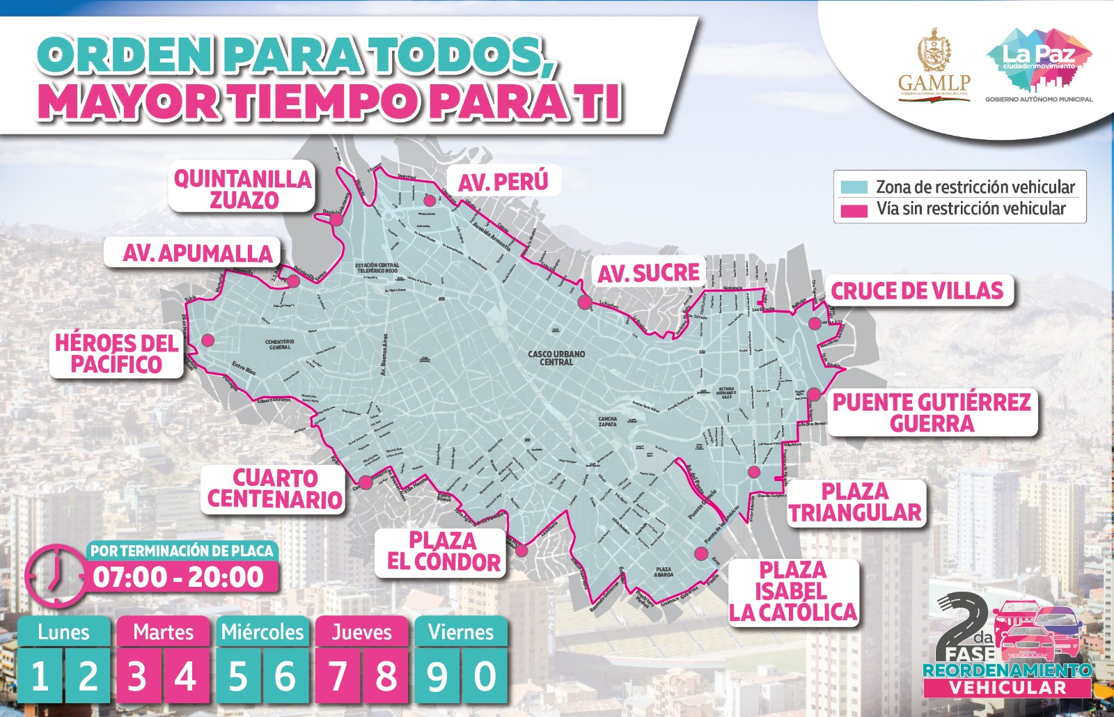 Desde el próximo 27 de marzo, la Alcaldía de La Paz aplicará la segunda fase del reordenamiento vehicular, que consiste en la ampliación del área de restricción vehicular por el número de placa. La medida será aplicada desde las 07:00 hasta las 20:00 de lunes a viernes.