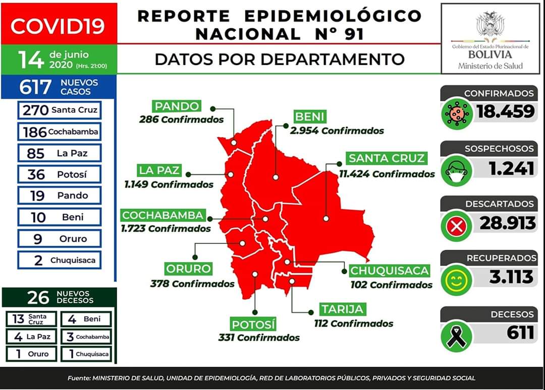 14 de junio (Urgente.bo).- El Ministerio de Salud reportó que para este domingo fueron confirmados 617 nuevos casos de coronavirus, de los cuales 270 están en Santa Cruz, 186 en Cochabamba, 85 en La Paz, 36 en Potosí, 19 en Pando, 10 en Beni, nueve en Oruro y dos en Chuquisaca.