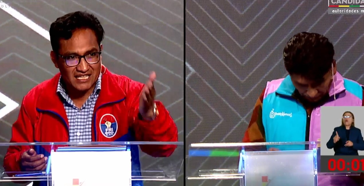 El debate se lleva con interrupciones de los candidatos al momento de preguntar.; así también Chirinos y Óscar Huanca tuvieron un rose. El debate de los candidatos de El Alto se desarrolla desde las 21:00 con tres ejes: economía y finanzas; ordenamiento y servicios; además de salud y educación.