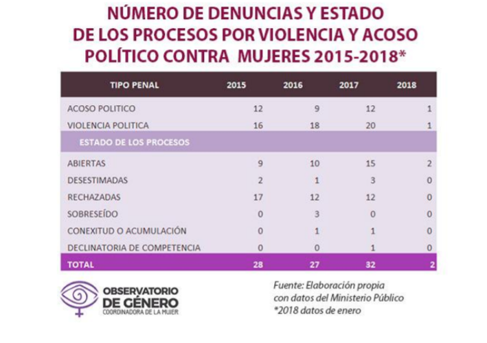 De acuerdo al Observatorio de Género, el 2017 la institución recibió 12 casos de acoso político y 20 de violencia política. Hasta marzo de este año ya se registraron dos casos más.