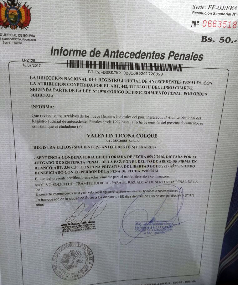 Según el opositor, Ticona fue condenado en 2016 a dos años de cárcel por el delito de Abuso de Firma en Blanco, tipificado en el artículo 336 del Código Penal, pero fue beneficiado con el perdón judicial para no entrar a la cárcel, señaló Erbol.