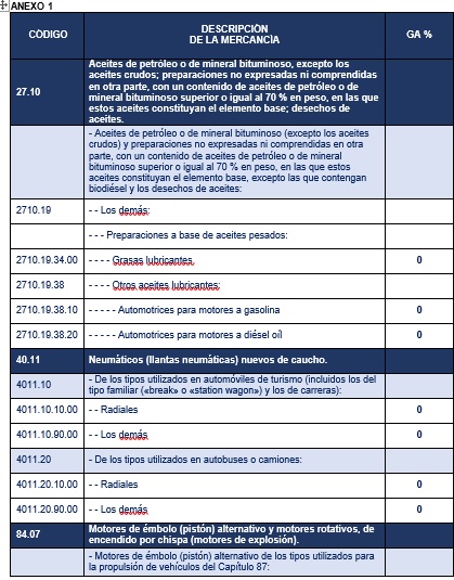 El Anexo 1 del decreto establece un arancel de importación cero (GA % = 0) para una lista técnica de productos esenciales para el transporte, como llantas, motores, aceites, lubricantes, baterías y repuestos de vehículos.