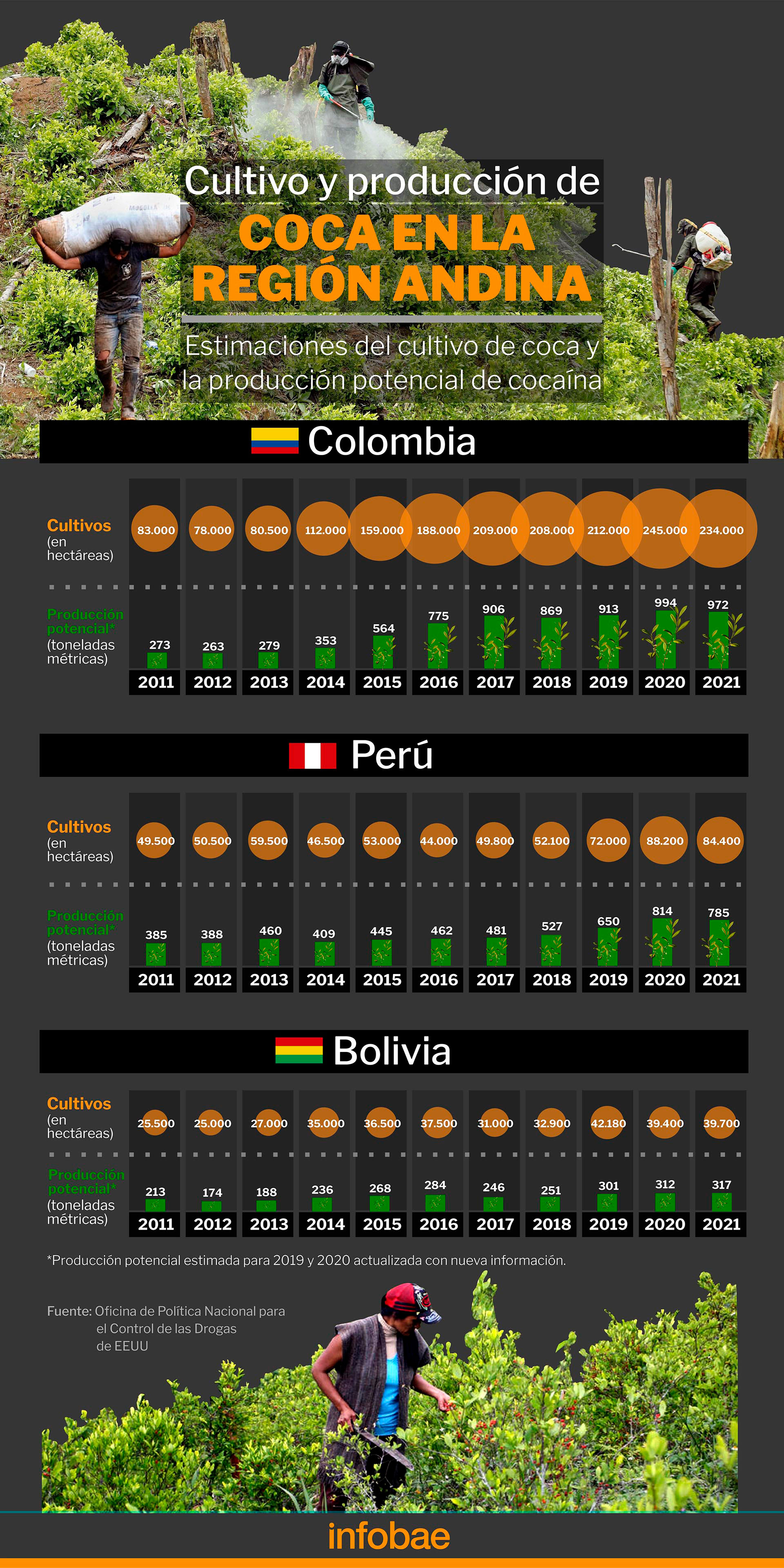 “Los niveles elevados de producción de cocaína en América del Sur representan un desafío de seguridad para los países andinos y una amenaza para la salud pública de Estados Unidos”, afirmó la oficina.