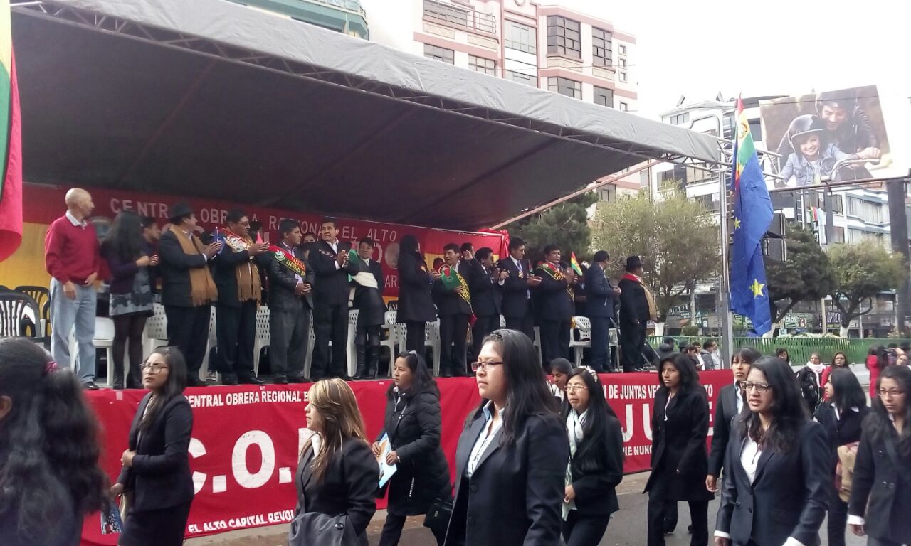 La Paz, 6 de marzo (Urgentebo) .- Por primera vez, los alteños festejaron el aniversario 33 de la joven ciudad en medio una notoria división que se evidenció en dos desfiles; uno organizado por la Alcaldía, que contó con la participación del gobernador paceño Félix Patzi y el líder de Unidad Nacional (UN) Samuel Doria Medina y el otro fue convocado por las organizaciones sociales afines al Movimiento Al Socialismo (MAS), esta contó con la participación de dos ministros y los asambleístas que representan a El Alto.