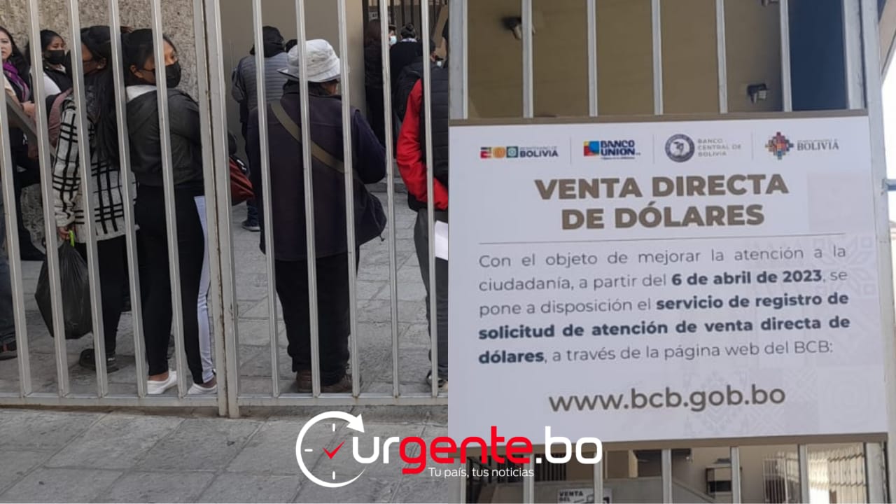 “Con el objetivo de mejorar la atención a la ciudadanía, a partir del 6 de abril de 2023, se pone a disposición el servicio de registro de solicitud de atención de venta directa de dólares, a través de la página web del BCB. www.bcb.gob.bo”, indica un letrero que está en puertas del principal banco del país.