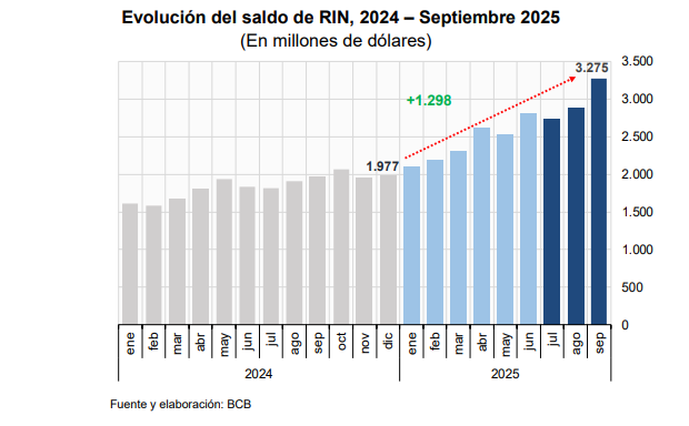 “Al 30 de septiembre, las RIN alcanzaron un saldo de $us3.275 millones lo que representa un incremento de $us1.298 millones con relación a diciembre de 2024, resultado que confirma no solo la estabilidad de las reservas, sino el desempeño significativamente positivo en lo que va de la presente gestión”, dice el comunicado del BCB.