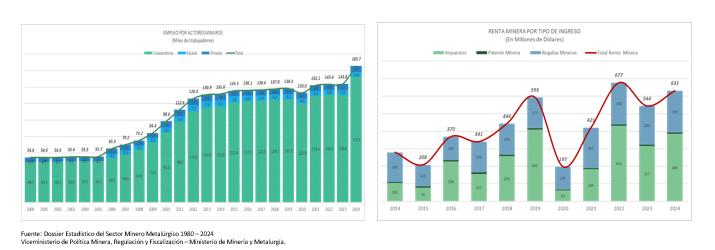 En cuanto a la Renta Minera —regalías, impuestos y patentes— el sector aportó más de 631 millones de dólares en 2024, recursos que ingresaron directamente al sector público y que constituyen una fuente esencial de financiamiento para inversiones departamentales y municipales en infraestructura, servicios básicos, desarrollo productivo y programas sociales.