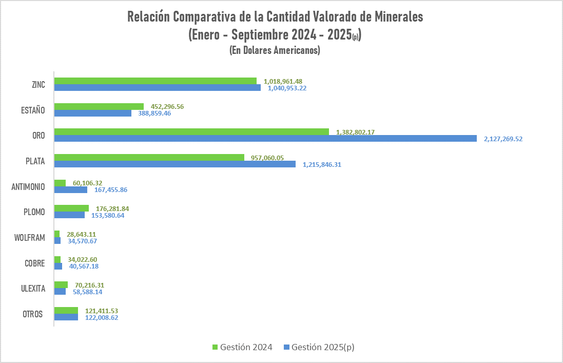 Los minerales Zinc, Oro, Plata, Antimonio, Wólfram y Cobre mostraron incrementos apreciables en su producción valorada en divisas durante el tercer trimestre de 2025, contribuyendo al fortalecimiento de los ingresos del sector. Sin embargo, el análisis comparativo entre los terceros trimestres de las gestiones 2024 y 2025 revela una ligera disminución en la producción valorada de Estaño, Plomo y Ulexita, lo cual representa un desafío técnico y productivo que debe ser atendido mediante estrategias orientadas a mejorar la eficiencia operativa, las capacidades tecnológicas y la sostenibilidad de la producción en estos minerales.
