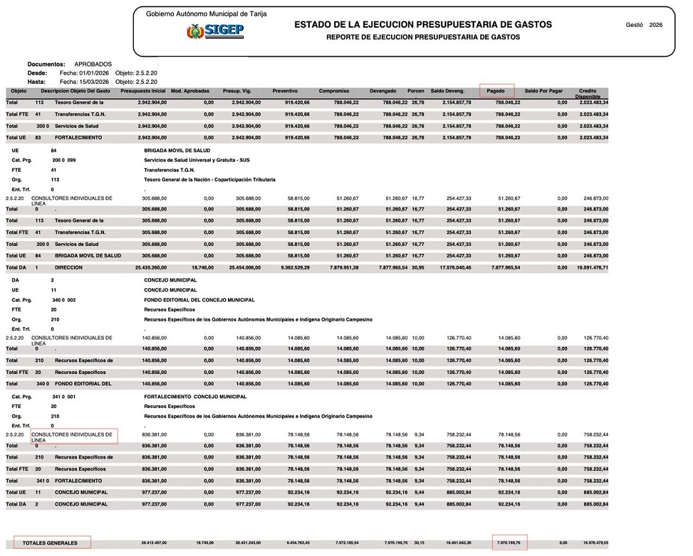 Documentos del Sistema de Gestión Pública (Sigep) detallan que la administración municipal de Jhonny Torres (Tarija) gastó en época electoral casi 10 millones de bolivianos en el pago a consultores y publicidad.