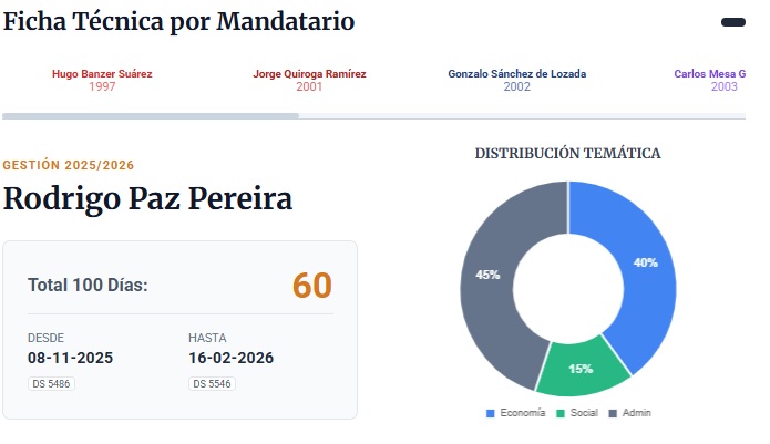 5 de abril (Urgente.bo).- El Centro de Gobierno (CENGOB) del Ministerio de la Presidencia (con base a la Gaceta Oficial del Estado) reveló a Urgente.bo que el presidente Rodrigo Paz, en 100 días de gestión, aprobó 60 decretos y es el que menos ha utilizado esta vía en los últimos 30 años, en comparación con otros gobiernos en el mismo periodo de tiempo.