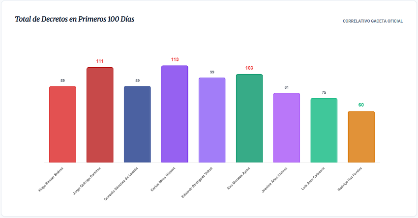 Los datos proporcionados a este medio revelan que, en los primeros 100 días de gobierno, Carlos Mesa fue el presidente con mayor cantidad de decretos aprobados (113), seguido de Jorge Quiroga (111), Evo Morales (103), emitiendo casi el doble de normativa por vía ejecutiva en el mismo lapso de tiempo. Asimismo, Eduardo Rodríguez Veltzé (99), Hugo Banzer Suárez (89), Gonzalo Sánchez de Lozada (89), Jeanine Añez (81) y Luis Arce (75).