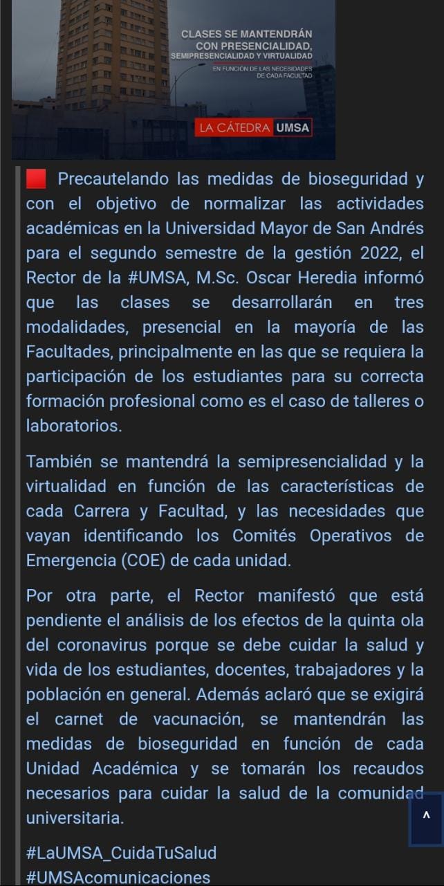 El pasado 28 de junio la UMSA a través de un comunicado, señaló que el rector Oscar Heredia, indicó que las clases a partir del segundo semestre de esta gestión serán en tres modalidades, presenciales, semipresenciales y virtuales, para ese entonces precautelar la salud de los estudiantes ante la quinta ola de Covid 19.