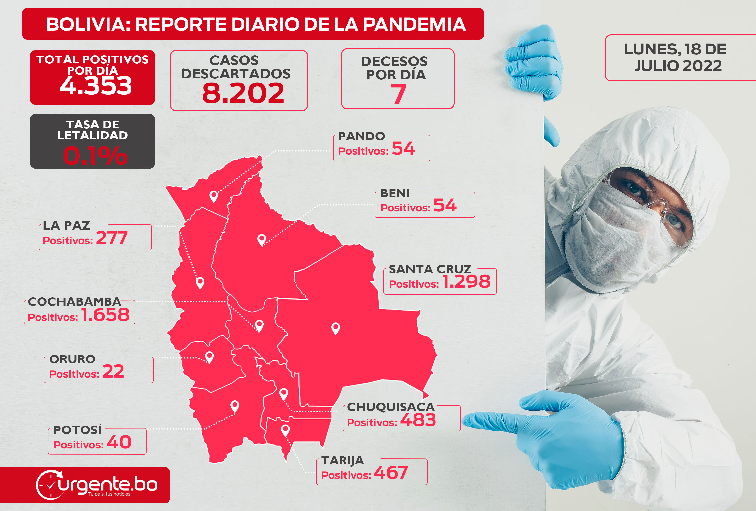 19 de julio (Urgente.bo).- El Ministerio de Salud informó que este lunes 4.353 personas dieron positivo al Covid-19 y se registró la muerte de siete pacientes.