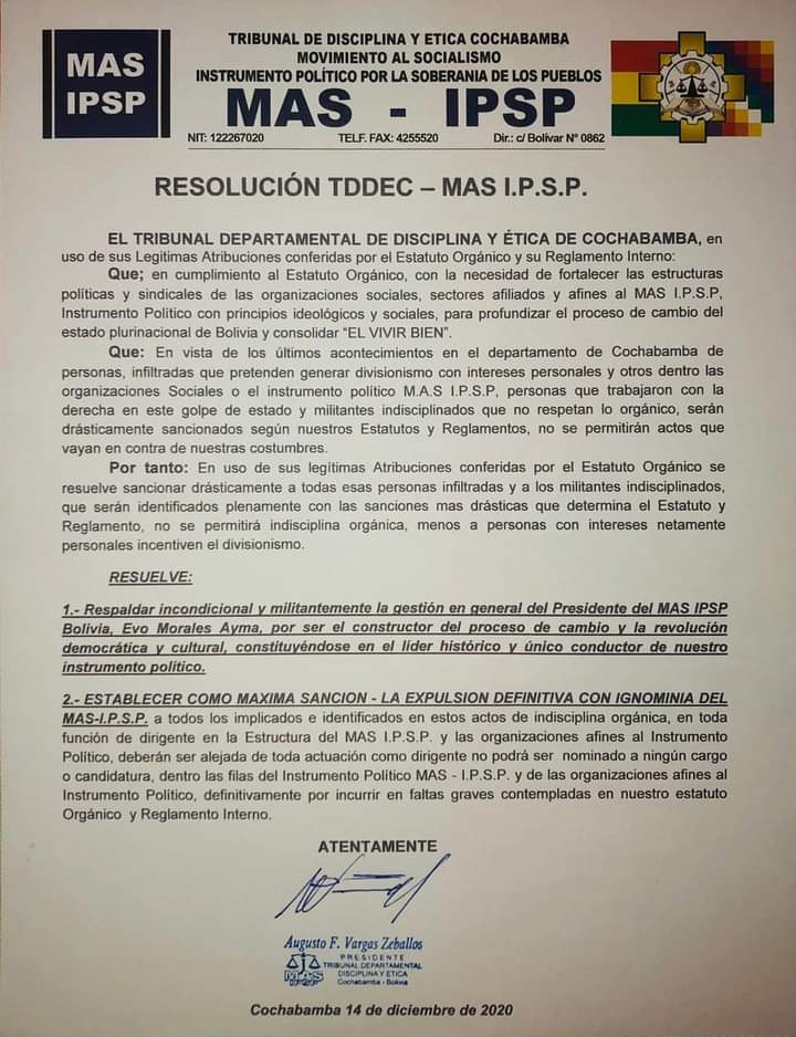 “Establecer como máxima sanción la expulsión definitiva con ignominia del MAS IPSP a todos los implicados e identificados en estos actos de indisciplina orgánica (…) definitivamente por incurrir en faltas graves contempladas en nuestro estatuto orgánico y reglamento interno”, dice parte de la resolución.