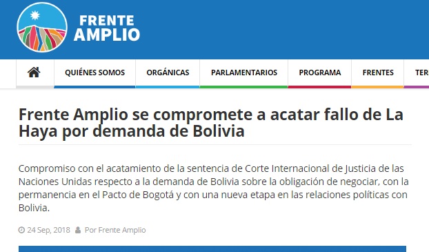 “Compromiso con el acatamiento de la sentencia de Corte Internacional de Justicia de las Naciones Unidas respecto a la demanda de Bolivia sobre la obligación de negociar, con la permanencia en el Pacto de Bogotá y con una nueva etapa en las relaciones políticas con Bolivia”, es el título de la nota publicada en el sitio web del Frente Amplio, una mesa que tiene presencia en el Parlamento del vecino país.