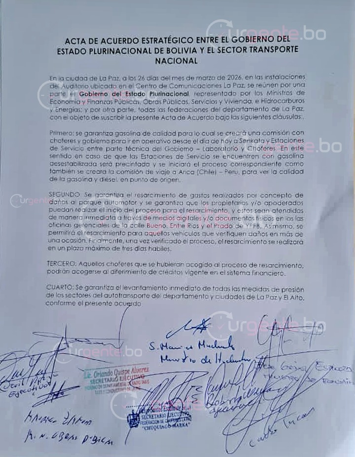 26 de marzo (Urgente.bo) El Gobierno de Bolivia y el sector del transporte de La Paz acordaron garantizar el suministro de combustible de calidad, resarcir los daños de los automóviles afectados en un plazo máximo de tres días, incluso a los vehiculos que presenten problemas en más de una ocasión, y por parte de los choferes, levantar de inmediato las medidas de presión. Tras la reunión de este 26 de marzo.