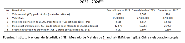 En la siguiente tabla se presenta el cálculo de la brecha entre precios de carbonato de litio grado técnico y grado batería. Como se puede apreciar, en 2024, la brecha alcanzó a un margen normal de $us.4.157 por tonelada métrica, mientras que, en 2025, la brecha se redujo de manera significativa a $us.1.897 por tonelada métrica debido a un mercado más ajustado que en el año anterior, principalmente entre los meses de septiembre a diciembre, que derivaron en un escalamiento de los precios spot del carbonato de litio grado batería en el mercado chino. Hasta aquí, el análisis no presentaría mayores dificultades.