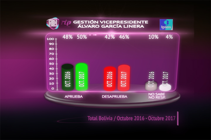 En octubre del año pasado Linera tenía 48 % de aprobación y este año subió 2% es decir el consentimiento ahora es de 50 %.