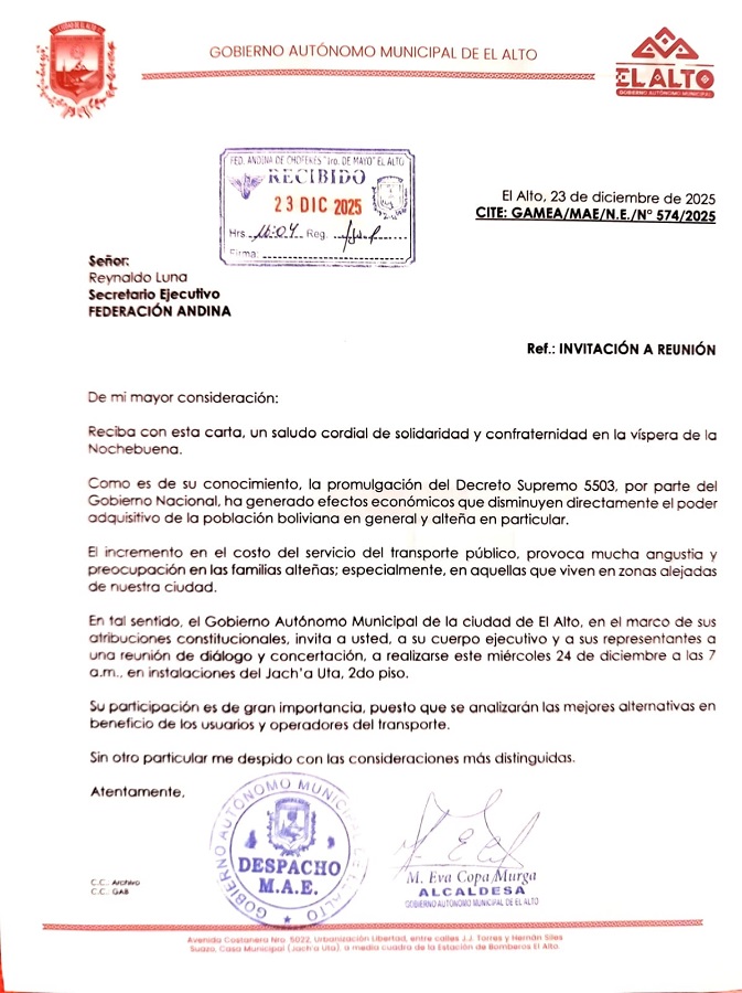 La Alcaldesa de El Alto, Eva Copa Murga, convocó este martes al Secretario Ejecutivo de la Federación Andina de Choferes de El Alto, Reynaldo Luna, a una reunión para analizar los efectos del Decreto Supremo 5503 en la economía de las familias alteñas y el servicio de transporte en esta ciudad.