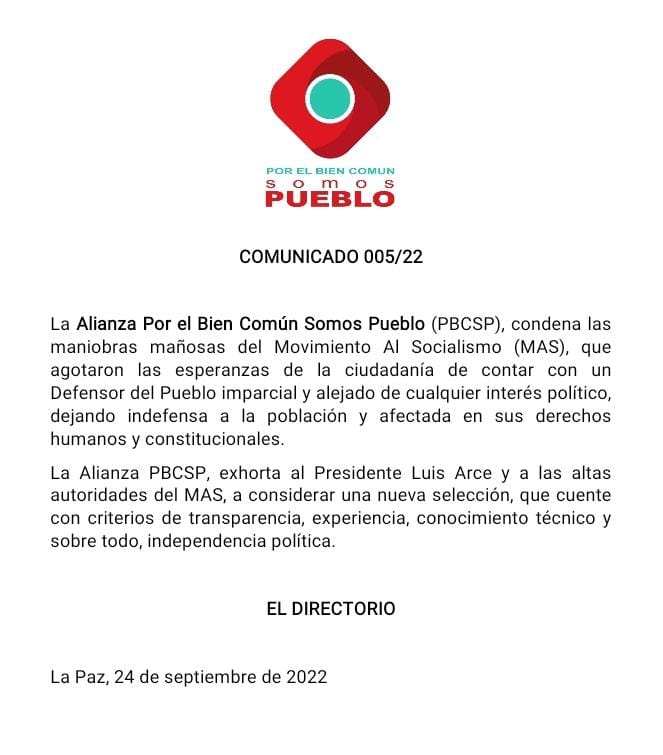 “La alianza PBCP exhorta al presidente Luis Arce y altas autoridades del MAS, a considerar una nueva elección, que cuente con criterios de transparencia, experiencia, conocimiento técnico uy sobre todo, la independencia política”, dice un comunicado.