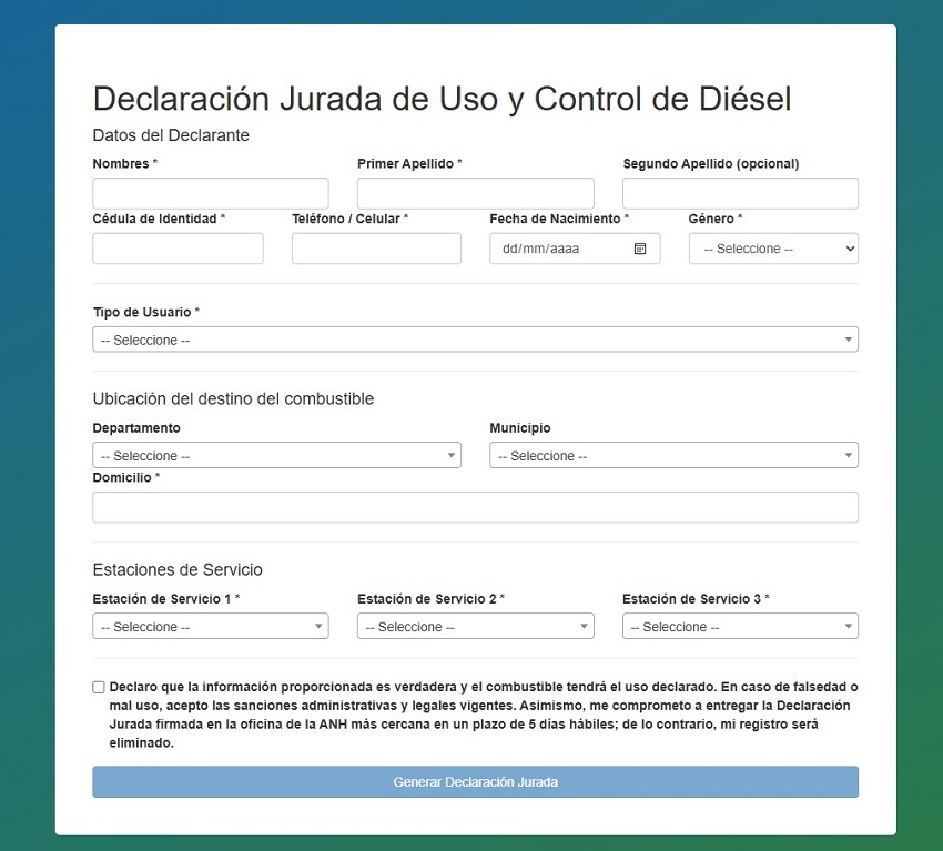 En el marco del Decreto Supremo 5503, la Agencia Nacional de Hidrocarburos (ANH) emitió la Resolución Administrativa 0025/2025, que define que los usuarios directos podrán cargar diésel con un registro mediante una declaración jurada en línea.