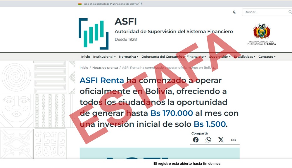 La Autoridad de Supervisión del Sistema Financiero (ASFI) informó este martes que detectó la circulación de un sitio web fraudulento denominado “asfi-renta.com”, que utiliza de manera ilegal su nombre, imagen institucional y recursos visuales oficiales con el objetivo de engañar a la población y captar dinero de forma ilícita.