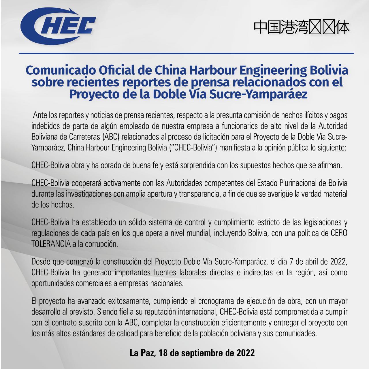 19 de septiembre (Urgente.bo).- A través de un comunicado, la empresa China Harbour Engineering Company (CHEC), informó que está dispuesta a colaborar en las investigaciones que sigue el Ministerio Público que implican a representante legal Zhengyuan Jim y a al contador Jesús Esteban A.S, ambos sindicados por investigación de ganancias ilícitas.