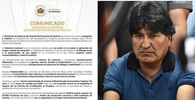 El gobierno dedicó un largo comunicado de más de 10 párrafos para responder a una advertencia de Evo Morales sobre la inminencia de la aprobación de un estado de sitio.