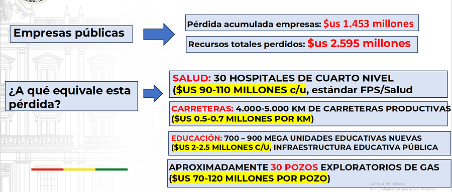 Este lunes, el Ministro de la Presidencia, José Luis Lupo, dio a conocer un primer informe sobre la situación de las empresas estatales, creadas en el gobierno del MAS desde el 2006. La conclusión es que el financiamiento para el proyecto de la industrialización ha sido un fracaso y ha desangrado al Banco Central de Bolivia. Un total de 14 empresas del anterior periodo le han costado pérdidas por 2.595 millones de dólares, un monto que pudo haber permitido construir 30 hospitales de cuarto nivel.