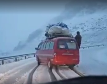 Un video que circula en las redes sociales, muestra cómo un minibus se arrastra en la pista congelada y un hombre trata de hacer peso para que el automotor no choque contra el cerro o se deslice al precipicio.