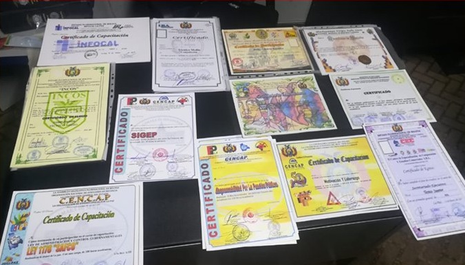 “Hay distintos certificados en especial de los certificados de Incos y contadores. Se han hallado más de 100 sellos, hay sellos del Ministerio de Educación, sellos de la UPEA entre otros”, manifestó.